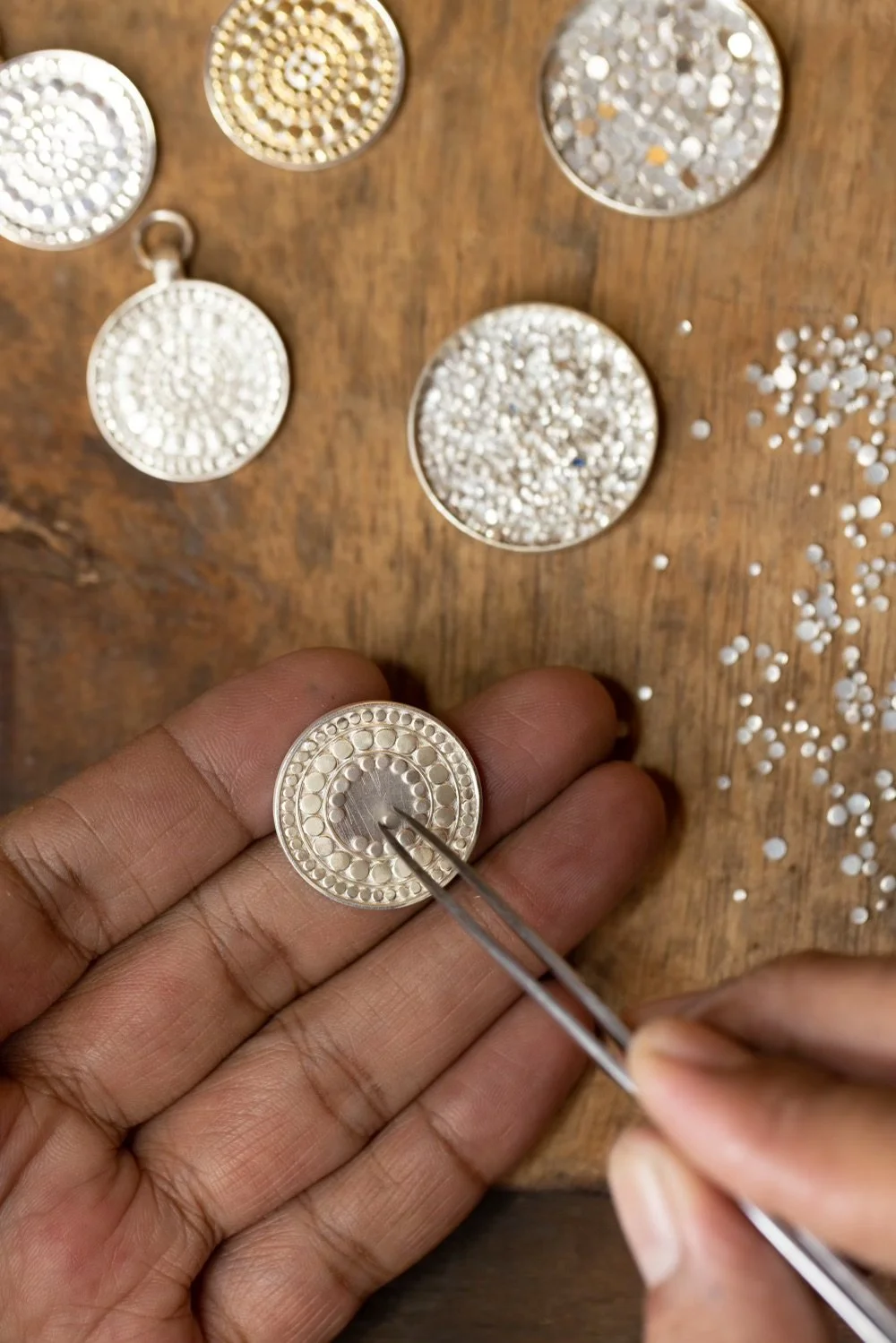 What really drew me to the Balinese handmade jewelry was this dot technique that I came across years ago. It's a dot/circle method, and that’s become our signature. That's what people gravitate towards. They like that they can recognize it's our brand. But like every good designer, I always strive to reinvent the wheel, which for me meant going into stones, so we created this new collection called Rasa. I love this one in particular because it allowed me to be more experimental and I like challenging myself. In a lot of my earlier collections, I was really playing with texture and shapes - those are probably some of my favorites.